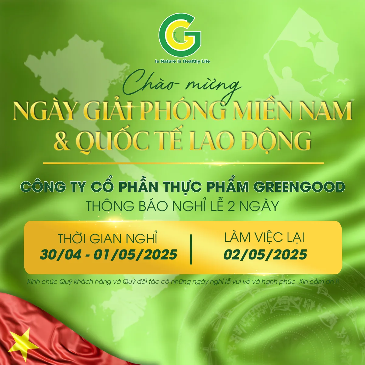 Nhân dịp Ngày Giải phóng Miền Nam và Quốc tế Lao động, Greengood kính chúc Quý khách hàng và Quý đối tác một kỳ nghỉ tràn đầy niềm vui, sức khỏe và hạnh phúc bên gia đình.