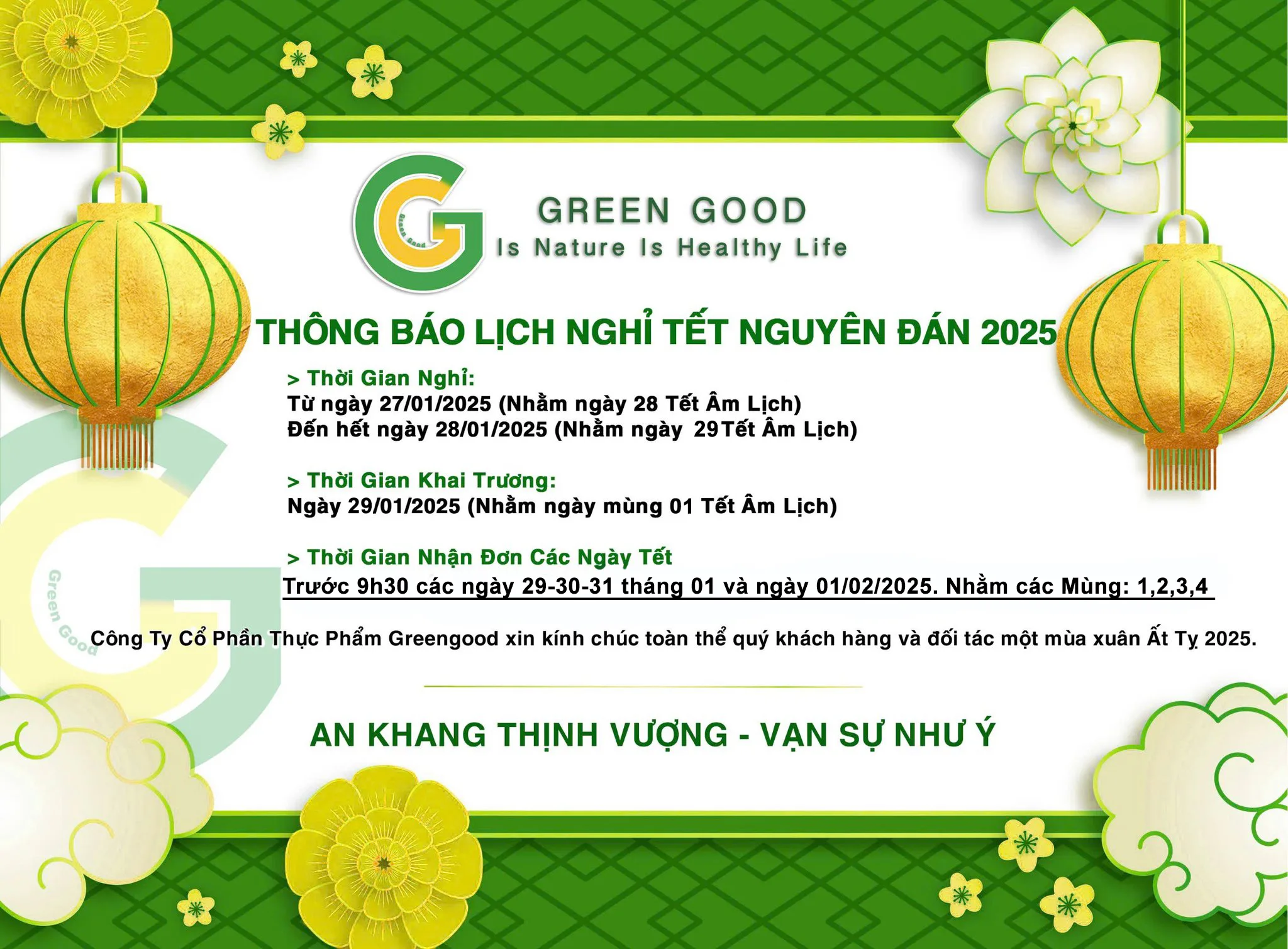 Công ty cổ phần thực phẩm Greengood xin kính chúc toàn thể quý khách hàng và đối tác một mùa xuân Ất Tỵ 2025 An khang thịnh vượng – Vạn sự như ý. Cảm ơn sự đồng hành và ủng hộ của quý vị trong suốt thời gian vừa qua.